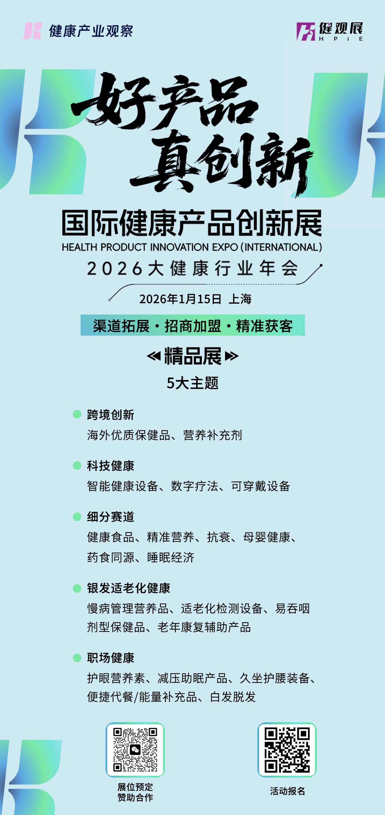 2025年,银发经济规模逼近 16 万亿元,职场健康需求持续爆发,大健康产业正迎来黄金增长期,但 “资源分散、趋势模糊、终端落地难” 三大痛点仍制约着企业发展。一场旨在破解行业困局的高端盛会 ——HPIE健观展(国际健康产品创新展),将于 2026 年1月15日在上海举办。不同于传统展会的 “流量聚集” 模式,本届展会以 “精品化整合、全链路赋能” 为核心,通过 “年会 + 颁奖 + 精品项目招商专场” 的联动形式,成为校准行业方向、链接核心资源的关键价值锚点。