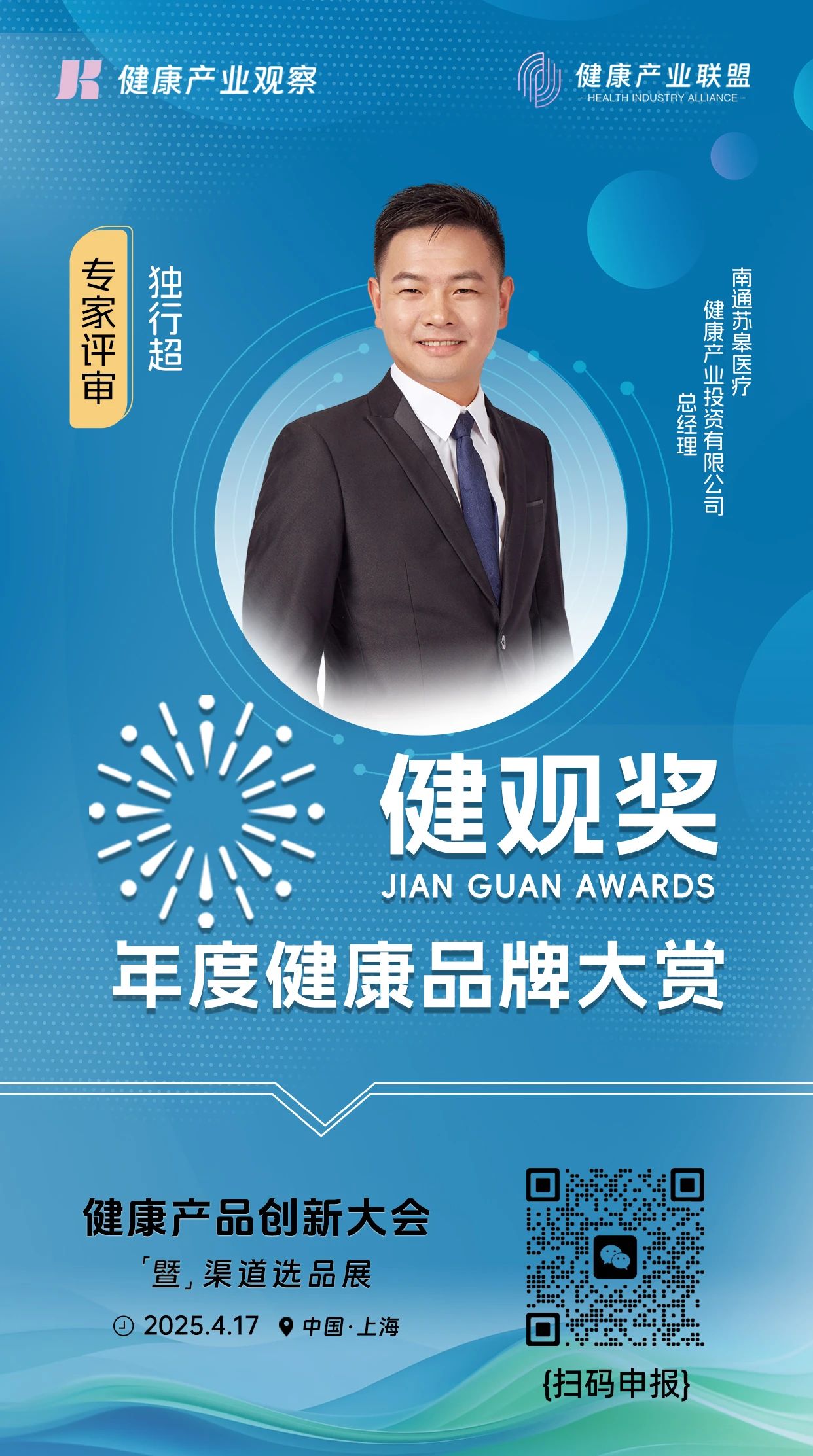 评委嘉宾|南通苏皋医疗健康产业总经理独行超加入【健观奖·年度健康品牌大赏】专家评审团