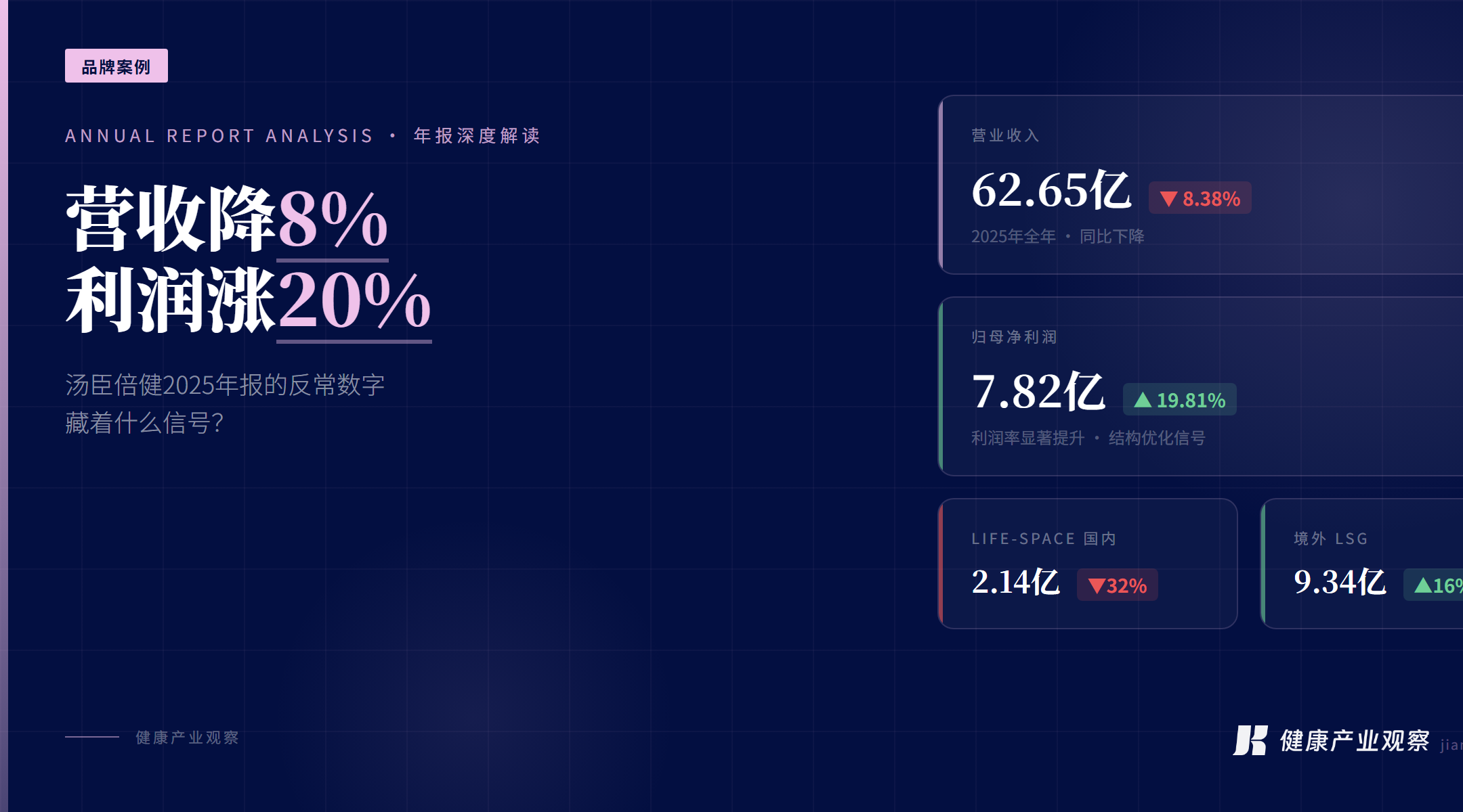 2026年3月20日,汤臣倍健发布2025年年度报告。两个数字,放在一起看,有点奇怪:营收62.65亿元,同比下降8.38%。净利润7.82亿元,同比增长19.81%。收入在跌,利润在涨。这个组合,在...