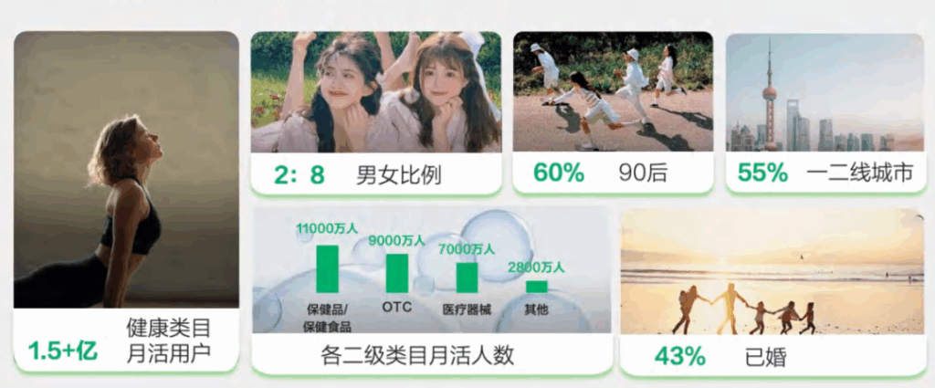 小红书医疗健康类目月活超 1.5 亿,每 10 个互联网用户就有 1 个在此找健康答案。用户画像多元:一二线人群超半数,女性占 80%,已婚群体超 4 成 —— 妈妈关注儿童营养,职场女性紧盯抗疲劳,中老年人偏爱中式滋补,覆盖全年龄段。