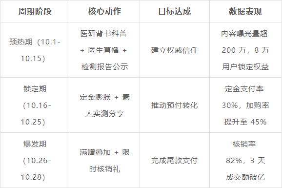 这种长周期策略精准契合了男性健康消费“先考证、再下单” 的特点,将行业平均7天的决策周期转化为信任积累期,为爆发期的高转化奠定基础。