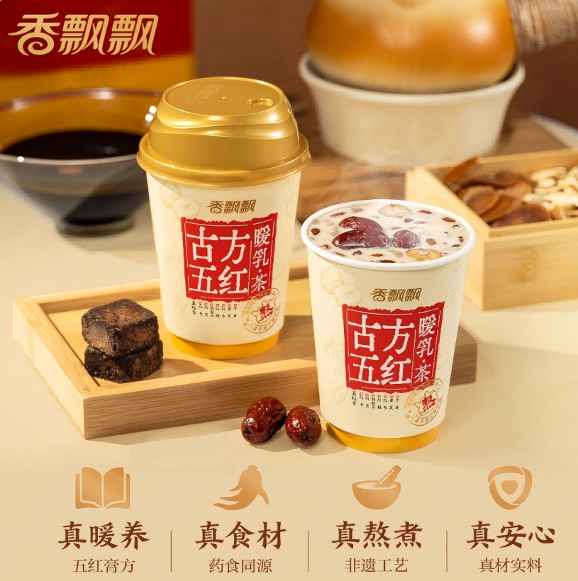 10月28日,杯装奶茶开创者香飘飘与浙江中医药大学在杭州签约,共同成立“健康养生饮品研究院”,聚焦药食同源养生饮品研发。同步亮相的首款产品“古方五红暖乳茶”,以吉林红参、宁夏枸杞、甘肃黄芪等道地食材为核心,搭配八道非遗熬煮工艺,标志着香飘飘从“奶茶巨头”向“健康茶饮引领者”转型。这并非个例,2025年以来,越来越多传统饮品企业涌入药食同源赛道,背后是千亿市场引力与行业转型的必然。