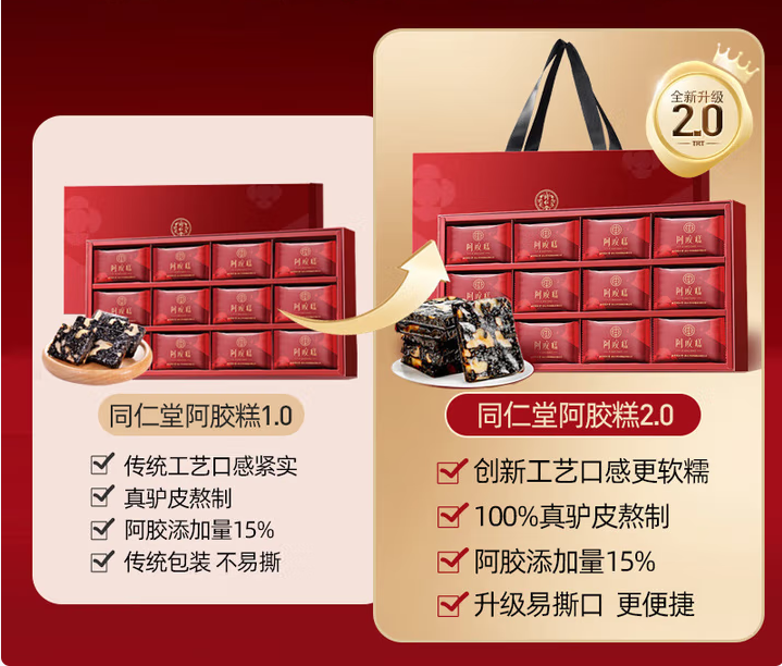 传统滋补品的年轻化困局,首先卡在“食用门槛”上。以阿胶为例,传统吃法需经历泡发、烊化、熬制等多个步骤,全程耗时数小时,且需精准控制火候,让习惯快节奏生活的年轻人望而却步。同仁堂的创新给出了破局思路——推出独立小袋即食阿胶糕,将原本需要复杂加工的滋补品转化为“开袋即食”的零食化产品,每袋净含量控制在10克,恰好满足单次食用需求。