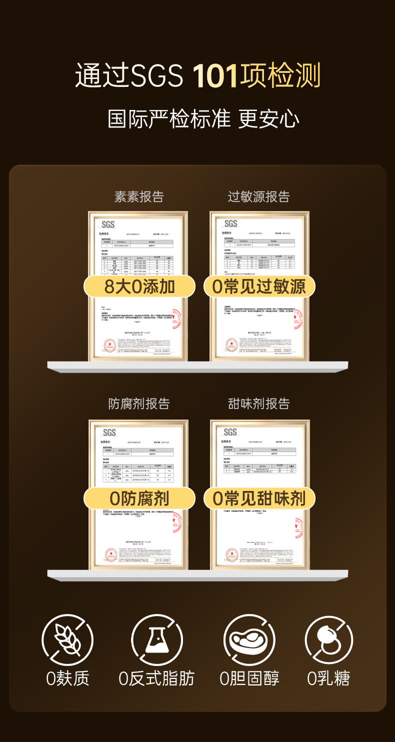 产品坚持 “天然、安全、温和” ,经第三方权威机构SGS的101项检测,其中包含激素专项检测,产品明确实现8大0添加:0激素、0常见过敏源、0麸质、0防腐剂、0常见甜味剂、0反式脂肪、0乳糖、0胆固醇,同时,产品重金属残留量远低于国家标准限值,微生物指标也完全符合国际食品级安全要求,以严苛标准筑牢安全防线,为女性养护提供安心品质保障。